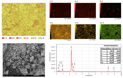СЭМ анализ синтезированного комплексного соединения меди с 2,2'-сульфандиилбис(5-метил-1,3,4-тиадиазолом) показал информацию о пористой и фрагментированной неоднородной текстуре, что говорит о возможном аморфном характере соединения [12]. Результаты СЭМ-ЭДА демонстрируют, что основные элементы - углерод, азот, сера, кислород, хлор и медь - присутствуют в пропорциях, согласующихся с ожидаемой структурой ([Cu(L)2H2O]Cl2) комплексного соединения с хлоридом меди (рис. 3). Экспериментальные данные по атомным долям элементов подтверждают наличие одной молекулы воды в комплексе [Cu(L)2H2O]Cl2. Рассчитанная теоретическая атомная доля кислорода (3.33%) соответствует экспериментальному значению (3.45%) с минимальным отклонением, что свидетельствует о присутствии одной молекулы воды в составе комплекса.
