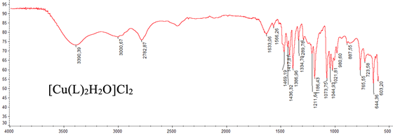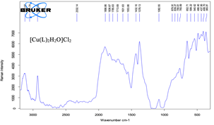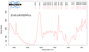 В работе были использованы сканирующая электронная микроскопия и энергодисперсионный анализ СЭМ-ЭДА (JEOL JSM-IT200LA, Япония). Квантово-химические расчёты проведены метод теории функционала плотности (DFT), реализованным в пакете GAUSSIAN 09, с функционалом B3LYP; (базисы 6-311G(d,p) для лиганда и GenECP (LANL2DZ для 3d-металлов и 6-311G(d,p) для остальных атомов), для расчёта спектров плотности состояний (DOS) использовалась программа GaussSum 3.0. ИК-спектры были получены на ИК-Фурье спектрометре “IRAffinity-1S” фирмы SHIMADZU (Япония), Раман-спектры были зарегистрированы в области 300-3300 см-1 на спектрометре BRAVO фирмы Bruker (Германия). Образцы дериватограмм синхронного дифференциально-термического анализа (ТГ-ДТА) получали на синхронном термоанализаторе Shimadzu DTG-60, реализующим совмещение термогравиметрии и дифференциального термического анализа. Программа нагрева печи от 37 до 800°C осуществлялась электронным нагревателем со скоростью 10°C/мин, при продувке аргоном (80 мл/мин). Держателем служил фарфоровый тигель. Разрешение сигнала при ТГА 0,1 мкг.