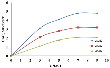 Перед осуществлением реакции модификации цианогруппы полиакрилонитрильного волокна были активированы гидроксиламином. Для этого в круглодонную колбу емкостью 250 мл помещали 6 г гидросульфата гидроксиламина, 5 г NaOH, 5 г PAN-волокна, которую помещали в термостат и нагревали при 373 К в течение 10-15 минут. Затем волокно промывали дистиллированной водой до нейтральной среды и сушили на воздухе до постоянной массы. Далее в круглодонную колбу емкостью 200 мл помещали 50 мл 30, 40, 50% раствора СА и 2 г активированного гидроксиламином PAN-волокна. Колбу устанавливали в термостат, и реакцию модификации проводили при продолжительности 1, 3, 4, 5, 7, 9 часов и температуре 353, 363, 373 К.