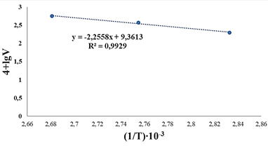 Рисунок 4. Зависимость lgV от 1/T. [СА]=50%, τ =7 час.
