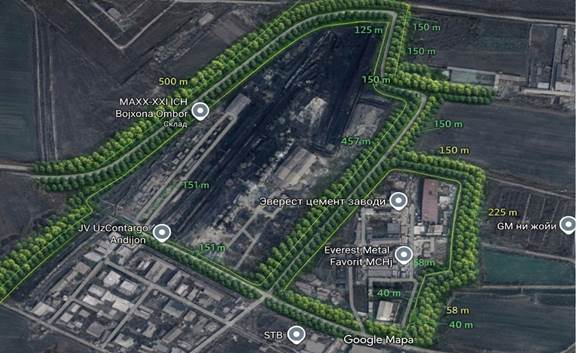Проектируемая зелёная защитная зона формируется в виде однорядных насаждений по периметру промышленной площадки рис 1. Выбор древесных пород осуществлялся с учётом скорости роста, устойчивости к пылевой нагрузке и способности к улавливанию аэрозольных частиц.