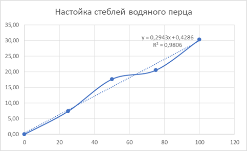 Для расчета ингибирующей концентрации образцов IC50 - раствора ДППН до 50% в каждом эксперименте был построен следующий график на основе значений антирадикальной активности (ARF%) на 30-й минуте и объема добавленных спиртовых образцов и рассчитан на основе проведенной на него функции линии тренда.[7].