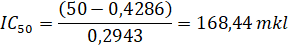 Для расчета ингибирующей концентрации образцов IC50 - раствора ДППН до 50% в каждом эксперименте был построен следующий график на основе значений антирадикальной активности (ARF%) на 30-й минуте и объема добавленных спиртовых образцов и рассчитан на основе проведенной на него функции линии тренда .[8].