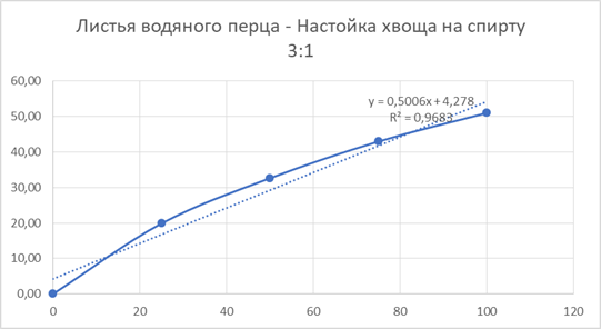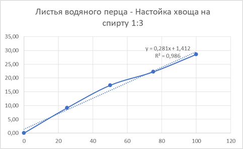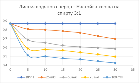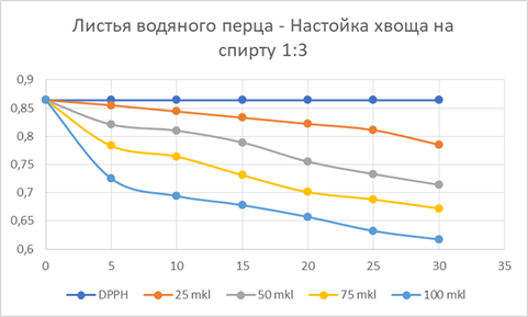 Приготовление экстрактов образцов. Спиртовые образцы в различных соотношениях на основе листьев водяного перца и хвоща были приготовлены с целью проверки антиоксидантности.[4]Приготовление экстрактов образцов проводили экстракцией 1 г растительного образца в 25 мл 96% этанола в течение 20 минут в ультразвуковой ванне. Полученный экстракт пропускали через шприцевый фильтр 0,45 мкм и использовали для анализа. Все отфильтрованные образцы разбавляли в 10 раз.