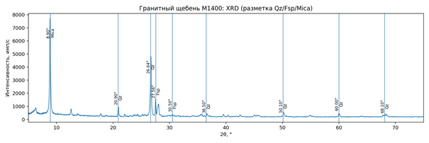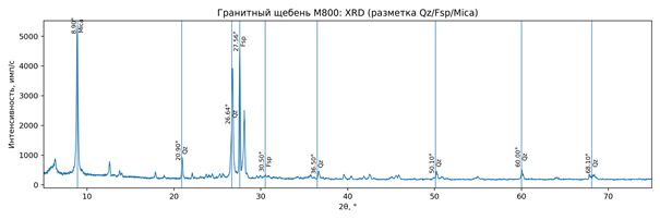 Рентгенофазовый анализ (XRD) применяется для качественной идентификации кристаллических фаз и подтверждения гранитной природы заполнителя.