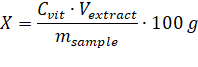 Where X represents the vitamin content in 100 g of the sample (mg); Cvit is the concentration of the vitamin in the extract determined by HPLC (mg/L); Vextract denotes the volume of the sample extract (L); msample is the mass of the sample used for extraction (g).