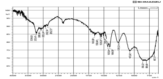 The IR spectroscopy of the substances obtained during the experiment was analysed. A valence vibration belonging to the bonded OH group is present in the region of 3089.96 and 3055.24 cm-1, the –C–H– group valence vibration in the 2922.16–2852.72 cm⁻¹ region, the starch ring valence vibration at 1653 cm⁻¹, and the NH4 group valence vibration at 3234.62 cm⁻¹, The deformation vibration at 1435.04 cm⁻¹ shows characteristic absorption bands of the bending and stretching vibrations. The P–O–C bonds also gave characteristic valence and deformation absorption bands at 1072.42 cm⁻¹. In IR spectroscopy, the characteristic valence vibration of the C–N bond at 800.46 cm⁻¹ and the region corresponding to the P=O bond at 1259.52 cm⁻¹ allow us to observe the bonds associated with the starch-bound ammonium polyphosphate.