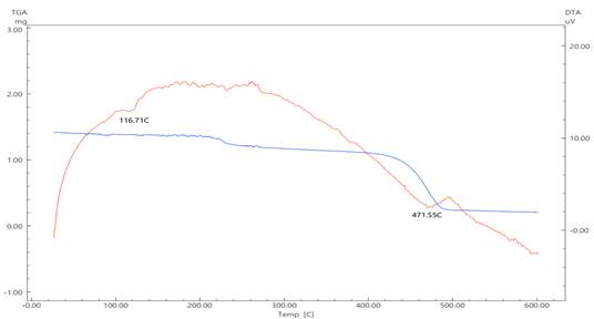 TGA and DTA analysis: To evaluate the thermal stability of modified polyacrylonitrile, analyses were performed using thermogravimetric analysis and differential thermal analysis (using a Shimadzu DTG-60/60H instrument with an accuracy of 99%).