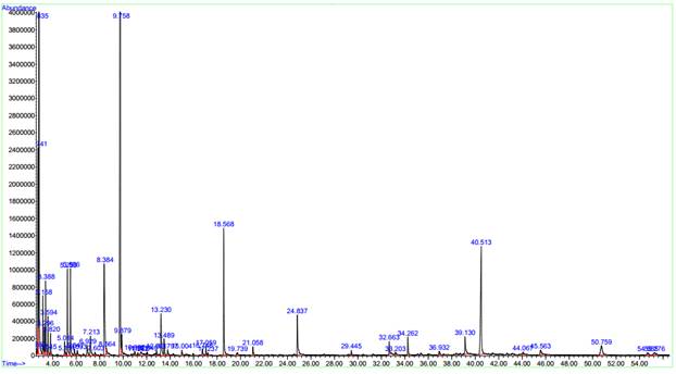 Рисунок 1. Хроматограмма ГХ-МС эфирного масла, полученного мeтодом гидродистилляции из надземной части Datisca cannabina L.