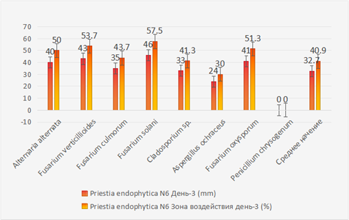 Полученные результаты показали, что штамм Priestia endophytica N6 проявлял высокую антагонистическую активность по отношению к различным фитопатогенным грибам (Рис. 1). Исключением стал только Penicillium chrysogenum, по отношению к которому антагонистическая активность не была зарегистрирована. В первый день роста бактерии наблюдалась зона воздействия 12,5%, однако на второй день гриб покрыл колонию бактерий. В таблице данное воздействие обозначено знаком «–». Антифунгальная активность данного штамма по остальным грибам достигала максимальных значений на третий день.