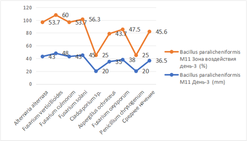 Антифунгальная активность штамма Bacillus paralicheniformis M11 достигала максимального ингибирующего эффекта на третий день. Данный штамм проявлял антагонистическую активность против всех исследуемых фитопатогенных грибов. Процент зоны воздействия выше 50% был зафиксирован для Alternaria alternata и Fusarium culmorum (53,75%), Fusarium verticillioides (60%) и Fusarium solani (56,25%). По отношению к Aspergillus ochraceus (43,75%) и Fusarium oxysporum (47,5%) активность была ниже, а минимальные значения наблюдались для Cladosporium sp. и Penicillium chrysogenum (по 25%) (Рис. 2).