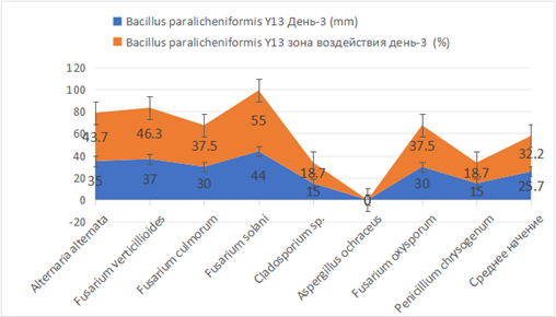 Влияние штаммов представлено в таблице 2. Антифунгальная активность штамма Bacillus paralicheniformis Y13 достигала максимального ингибирующего эффекта на третий день. Данный штамм не проявлял антагонистической активности только по отношению к Aspergillus ochraceus. В первый день наблюдался рост бактериальной колонии (площадь воздействия — 18,75%), однако на второй день гриб полностью перекрыл бактериальную колонию. В таблице данный результат обозначен знаком «–». По отношению ко всем остальным фитопатогенным грибам штамм проявлял антагонистическую активность.