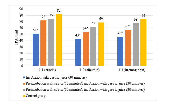 The level of TPA of Group 1.1 after 30 minutes of incubation with gastric juice (30 minutes) was 51±4.5 u/ml, which is significantly lower compared to TPA of Group 3.1. However, the TPA of Group 1.1 after 10 and 30 minutes of preincubation with saliva with further incubation with gastric juice (30 minutes) was 72 u/ml and 75 u/ml, respectively, which was significantly higher compared to Group 1.1 and did not significantly differ compared to the TPA of Group 3.1. The levels of TPA after 10 and 30-minute exposure to the enzymes contained in saliva did not differ statistically significantly. Thus, the activity of casein hydrolysis by gastric juice significantly decreased with the addition of starch in a ratio of 1:5, but even 10 minutes of preliminary saliva exposure was enough for the activity of casein hydrolysis by gastric juice to reach a level characteristic of the absence of starch.