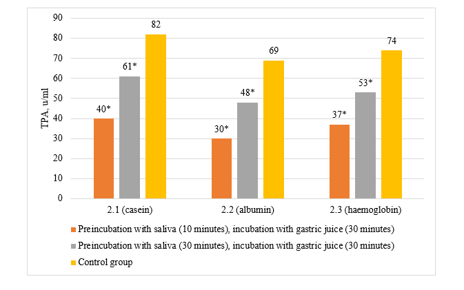 The level of TPA of Group 2.1. after 30 minutes of incubation with gastric juice without preincubation was 29±2.7 u/ml, which was significantly lower than that of the corresponding control group. After preincubation with saliva for 10 minutes preceding incubation with gastric juice, the level of TPA in Group 2.1 increased slightly and amounted to 40±4.4 u/ml. This indicator did not differ statistically significantly from the indicator typical for incubation with gastric juice without preincubation, and was still significantly lower than the TPA of the control group. Contrary to the trend characteristic of studies in Group 1, preincubation with saliva for 30 minutes also did not allow achieving an indicator that would be comparable to the TPA of the control group – the TPA of Group 2.1 in this case was only 61 u/ml. However, when preincubated with saliva for 30 minutes, the level of TPA was significantly higher compared to preincubation for 10 minutes. Therefore, for protein-starch substrates, which consist of starch and casein in a ratio of 5:1, preincubation with saliva for both 10 and 30 minutes does not allow achieving the level of proteinolysis characteristic of proteins in the absence of starch.