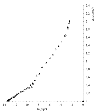 Параметры уравнения: для первой составляющей доля a01=0,358 ммоль/г, энергия E01=30,10 кДж/моль, показатель n1=9; для второй составляющей a02=0,953 ммоль/г, E02=19,35 кДж/моль, (n2=5); для третьей составляющей a03=5,014 ммоль/г, E03=1,43 кДж/моль, (n3=3).
