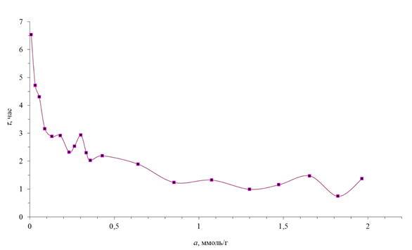 На рисунке 2 показана зависимость времени установления адсорбционного равновесия (τ) от величины адсорбции молекулы аммиака на гибридном бионанокомпозите ДАЦ–кремнезем. Адсорбция начальных молекул аммиака протекает замедленно, при этом время установления равновесия составляет 6,5 часа, тогда как при количестве адсорбата, близком к 0,131 ммоль/г, наблюдается уменьшение этого времени до 2,88 часа.