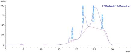 Figure 3 gives the chromatogram for the polyphenol determination of the extract of turnip leaf and the amount and capture Times of polyphenols Table 2. This shows that the turnip Leaf contained 100 g of quercetin 532.6 mg, salicylic acid 230.9 mg, rutin 22 mg, apigenin 15.9 mg in larger quantity and no kaempferol and gallic acid were seen. But the influence of quercetin on human health and well-being is positive in every respect. It’s one of the antioxidants which are said to lower inflammation, increase cardiovascular health, and, some studies have found, can prevent cancer from developing. Quercetin can alleviate allergies and help the immune system.