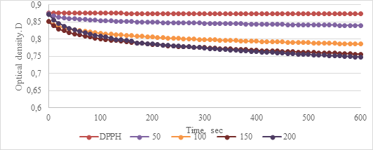 Experience 3. A purple 2,2-diphenyl-1-picrylhydrazyl (DPPH) solution gets discolored, which makes it possible to identify a hydrogen atom or pure antioxidant compounds that give electron. Stable DPPH• is a reagent employed to perform spectrophotometric analysis. In the present study, the Blois approach as adapted by the DPPH• method for determining nature of free radical thinning was utilized with slight modifications. A 0.812 mM DPPH• solution was prepared with ethanol in a measuring flask with a volume of 100 ml, wrapped with aluminium paper and the solutions were stored in a dark place at room temperature for 30 minutes. A 4 ml quartz cuvette was placed in a spectrophotometer (3 ml of DPPH solution + 200 µL of ethanol and the light absorption (D1) at 517 nm every 10 sec for 10 min was measured using the YOKE produced K7000 spectrophotometer (China). The antiradicality of the sample was established in the experiment by mixing 50, 100, 150, 200 µL of sample with 3 ml DPPH solution to determine light absorbency (D2) at 517 nm in the order presented above for each respective sample. Ethanol was added to the rest to bring the total volume of the solution in the cuvette to 3.2 ml. The antiradicality of the samples was determined by using (1) formula.