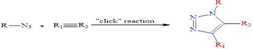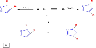 Общий синтетический путь 1,2,3-триазолов с использованием клик-химии описан на ( Схеме 1А.) Наиболее популярным путем получения 1,2,3-триазолов является катализируемая Cu(I) 1,3-диполярная циклоприсоединительная реакция Хьюзгена, представляющая собой взаимодействие органических азидов и алкинов, в результате которого образуются только 1,4-региоизомерные 1,2,3-триазолы (Схема 1B).[7] Если вместо Cu(I) для этой реакции использовать рутениевые катализаторы, основными продуктами являются 1,5-региоизомерные 1,2,3-триазолы,[8] и существует известный некаталитический термический путь, который приводит к образованию обоих региоизомерных 1,2,3-триазолов (Схема 1B).