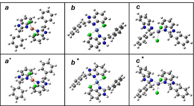Рисунок 1. Распределение заряды атомов комплексных соединений a. [CuCl2(FAB)2] b. [NiCl2(FAB)2] и c. [ZnCl2(FAB)2], так же длины связей a*. [CuCl2(FAB)2] b*. [NiCl2(FAB)2] и c*. [ZnCl2(FAB)2]