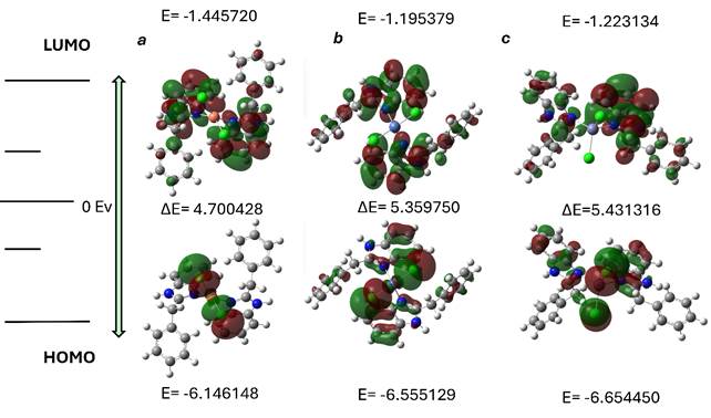 Расчёт фронтальных молекулярных орбиталей HOMO и LUMO для комплексов (a) [Cu(FAB)2Cl2], (b) [Ni(FAB)2Cl2] и (c) [Zn(FAB)2Cl2] (рис. 2) рассчитанные методом DFT показывает для каждого комплекса пространственные распределения высшей занятой (HOMO) и низшей незанятой (LUMO) орбиталей, а также соответствующие энергии орбиталей и величина энергетического зазора ΔE = E(LUMO) - E(HOMO).