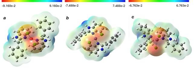 Рисунок 3. Карты молекулярного электростатического потенциала (ESP) для комплексов: a) [Cu(FAB)2Cl2]; b) [Ni(FAB)2Cl2]; c) [Zn(FAB)2Cl2]