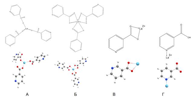 Цель настоящей работы: квантово-химическое моделирование возможных типов координации катиона La3+с никотиновой кислотой, установление их возможных электронных и термодинамических характеристик (PM7 // MOPAC v.22.1.1).