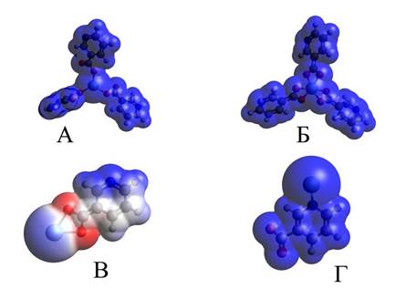 Синий цвет, наблюдаемый на поверхности комплексов А, Б, Г свидетельствует о дефиците электронной плотности и преобладании областей с частично положительным зарядом (δ+), электронная плотность данных соединений прочно связано координационными связями с лантаном. Напротив, атомы кислорода комплекса В имеют сильный отрицательный заряд (красная область), что способствует образованию амфифильного соединения, имеющего потенциальные центры нуклеофильного связывания [10, с. 2150-2165], а также вступать в различные взаимодействия с полярными веществами (например, с белками) [11, с. 191-207].