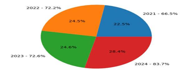 Анализ показывает, что в 2021 году показатель обеспеченности питьевой водой в районе составил 66,5 %. В последующие годы данный показатель продемонстрировал устойчивую тенденцию к росту и достиг 72,2 % в 2022 году и 72,6 % в 2023 году. Наконец, к 2024 году этот показатель заметно увеличился и составил 83,7 %. Рис.1