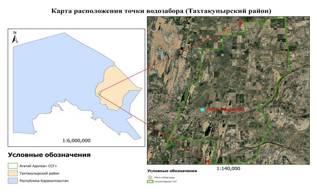 На данной карте показано точное местоположение точки наблюдений, расположенной на территории ССГ «Агатай Адилов» в Тахтакупырском районе Республики Каракалпакстан. Слева представлено общее местоположение территории, справа отмечена точка наблюдений. Рис.2