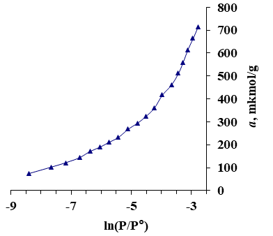 The adsorption isotherm describing the uptake of ammonia molecules by the Aerosil adsorbent is presented in Figure 1 using semi-logarithmic coordinates. The isotherm begins at a relative pressure of ln(P/P⁰) = –8.398, which corresponds to an initial adsorption capacity of 73.841 µmol/g. As the adsorption process continues, the isotherm curve shows a gradual increase, indicating the progressive accumulation of ammonia molecules on the surface.