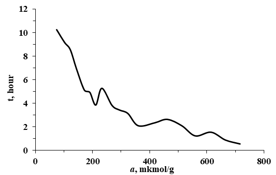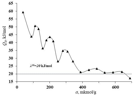 The differential heat of adsorption (Qd) for ammonia molecules interacting with the Aerosil surface is illustrated in Figure 2 and shows an oscillating decreasing pattern. At the early stages of adsorption, the Qd values decline from 60.10 kJ/mol to 43.88 kJ/mol. This trend suggests the progressive occupation of the most energetically favorable adsorption sites, accompanied by a gradual reduction in the adsorption enthalpy.