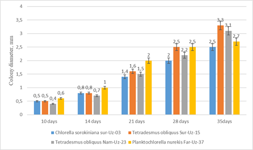 Conclusion. In this study, the growth dynamics and colony formation properties of local green microalgae - Tetradesmus obliquus Nam-Uz-23, Planktochlorella nurekis Far-Uz-37, Chlorella sorokiniana Sur-Uz-03 and Tetradesmus obliquus Sur-Uz-1 were comparatively evaluated in nutrient media with different compositions.