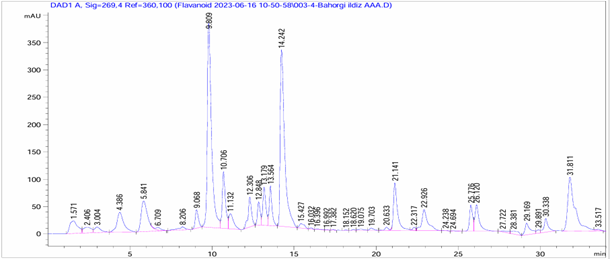 Установлено, что содержание фенольных компонентов возрастает в следующем порядке: кверцетин < галловая кислота < рутин < апигенин < лютеолин. Таким образом, среди всех идентифицированных фенольных соединений максимальная концентрация зафиксирована для лютеолина. Данный флавоноид, по всей видимости, вносит определяющий вклад в формирование антиоксидантного потенциала растения. Флавоноиды апигенинового и лютеолинового ряда характеризуются противовоспалительным и антиоксидантным действием, активно участвуя в нейтрализации активных форм кислорода.