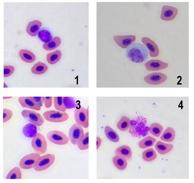 Рисунок 1. Лейкоциты в мазке крови перепела японского (Coturnix japonica). Окраска по Романовскому–Гимзе. Увеличение ×1000 (иммерсионная система). 1-лимфоцит, 2 – моноцит, 3 -базофил, 4 -гетерофил