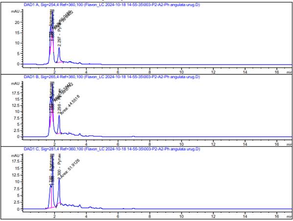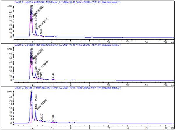 Из хроматограмм, представленных на рисунках 1 и 2, видно, что пики, соответствующие флавоноиду рутину, наблюдаются при временах удерживания 2,297; 2,298; 2,300; 2,324; 2,325, пики апигенина — при 1,755; 1,760; 1,762; 1,788; 1,791, а пики, относящиеся к галловой кислоте, — при 1,888 и 1,905. Различия между соответствующими пиками во всех трёх анализах являются незначительными, а полученные результаты анализа воспроизводятся с высокой точностью. По данным хроматографического анализа установлено, что в исследуемых образцах растения присутствуют рутин, апигенин и галловая кислота. Флавоноидный состав плодов и семян исследуемого растения характеризуется высоким содержанием рутина, который обладает выраженными противовоспалительными и антидиабетическими свойствами. Данный флавоноид составляет основную долю общего содержания флавоноидов в органах растения и занимает доминирующее положение по сравнению с другими соединениями. Установлено, что содержание рутина в плодах Ph. angulata составляет 100,674 мг/100 г, тогда как в семенах растения — 63,171 мг/100 г. Количество флавоноида апигенина, широко применяемого в исследованиях, направленных на борьбу с клетками рака молочной железы, составляет 14,854 мг/100 г в плодах Ph. angulata и 6,172 мг/100 г в семенах растения. Кроме того, установлено, что галловая кислота, обладающая высокой антиоксидантной активностью и придающая пищевым продуктам приятный вкус, содержится в плодах и семенах растения в количестве соответственно 8,472 мг/100 г и 1,251 мг/100 г.