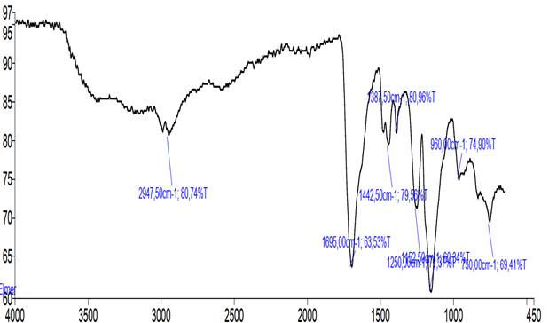 В ИК-спектре наблюдались области поглощения, подтверждающие вступление мономеров в реакцию сополимеризации. Полосы поглощения при 2947 см-1 характерны для валентных колебаний алифатических -CH2-и CH-групп в составе цепи сополимера, а сильная полоса при 1695 см-1 относится к валентным колебаниям C=O в составе карбоксильных групп, что означает, что функциональные группы в составе итаконовой и метакриловой кислот остаются в составе сополимера. Частоты поглощения, вызванные валентными колебаниями метильных (-СН3), метиленовых (-СН2) групп в области 1442 см-1, симметричные деформационные колебания, характерные для метакриловой группы CH3 при 1387 см-1, подтверждают наличие метильных групп в метакриловой кислоте. Полоса при 1250 см-1 принадлежит С-О связи карбоксильной группы. Самое главное, что полосы поглощения в области 1640 в его составе не наблюдались, винильные группы в метакриловой и итаконовой кислотах участвовали в сополимеризации.