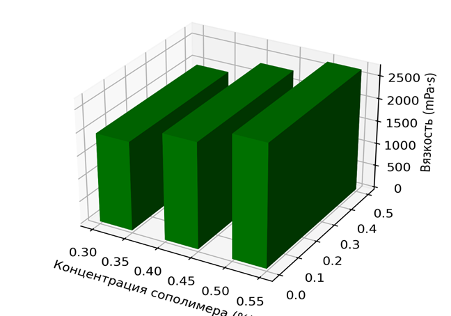 Влияние концентрации синтезированного сополимера на реологические характеристики жидкой моющей композиции было изучено в диапазоне 0,3–0,5 %. Установлено, что повышение содержания сополимера сопровождается закономерным увеличением вязкости системы. Так, при концентрации 0,3 % вязкость составляла около 1950 mPa·s, при 0,4 % возрастала до 2320 mPa·s, а при 0,5 % достигала 2680 mPa·s. Это указывает на выраженную загущающую способность полученного сополимера даже при относительно низких дозировках.