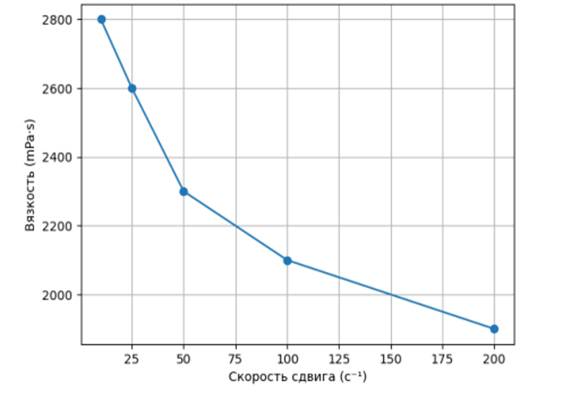 Анализ зависимости вязкости от скорости сдвига показывает, что при увеличении данного параметра от 10 до 200 с⁻¹ наблюдается снижение вязкости с 2800 до 1900 mPa·s. Подобное поведение свидетельствует о псевдопластическом характере течения системы. Уменьшение вязкости объясняется постепенной деструкцией внутренней структуры, сформированной макромолекулами сополимера, а также ориентацией полимерных цепей вдоль направления потока, что сопровождается ослаблением межмолекулярных взаимодействий. В условиях низких скоростей сдвига система сохраняет более упорядоченное состояние, обеспечивающее повышенное сопротивление течению, тогда как при их увеличении структура частично разрушается, облегчая деформацию и течение жидкости.