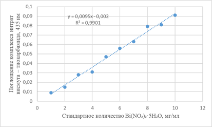 Линейная зависимость абсорбции от концентрации висмута (R² = 0,9901) использовалась для расчета содержания алкалоидов, так как комплекс висмут–алкалоид образуется в соотношении 1:1. Таким образом, количество висмута точно отражает количество алкалоидов в экстракте. Метод обеспечивает точность и повторяемость результатов, а комплекс устойчив более 24 часов, что позволяет надежно определять продуктивность эндофитов в различных средах [12].