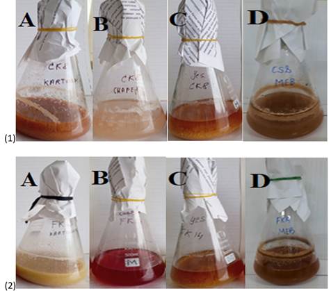 - Мальт-экстрактный бульон (MEB, g/L): мальт-экстракт – 20.0, пептон – 2.0, сахароза – 10.0, объем доводили до 1 л дистиллированной водой.
