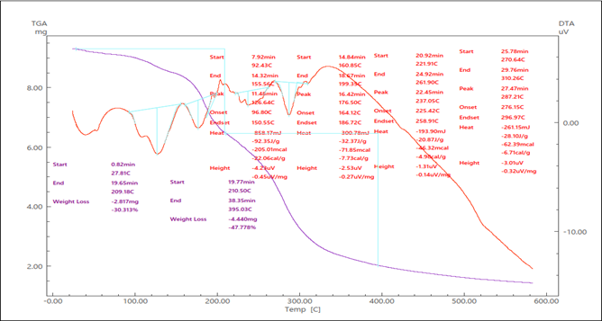 The thermal stability and decomposition behavior of the synthesized UFS polymeric ligand were evaluated using TGA and DTA techniques. The thermogram exhibits a well-defined three-stage weight loss process in the temperature range of 25–600°C. Stage I: An initial weight loss of 30.31% is observed between 27.81°C and 209.18°C. This stage is attributed to the evaporation of physically adsorbed water and the release of chemically bound moisture trapped within the polymer matrix. Stage II: The most intensive thermal degradation occurs from 210.50°C to 395.03°C, resulting in a significant mass loss of 47.78%. This corresponds to the structural cleavage of the polymer backbone, specifically the decarboxylation of succinic acid fragments and the breakdown of methylene bridges. Stage III: Above 400°C, the rate of mass loss decreases, leading to the formation of a stable carbonaceous residue. The TGA/DTA results demonstrate that the UFS ligand maintains its structural integrity up to approximately 200°C. This thermal robustness confirms that the sorbent is highly suitable for industrial wastewater treatment, where elevated temperatures may be encountered.