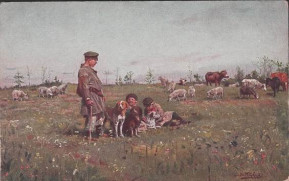 - На открытке изображены собаки, напоминающие спаниелей или сеттеров, которые часто использовались в охоте благодаря своему нюху и выносливости.