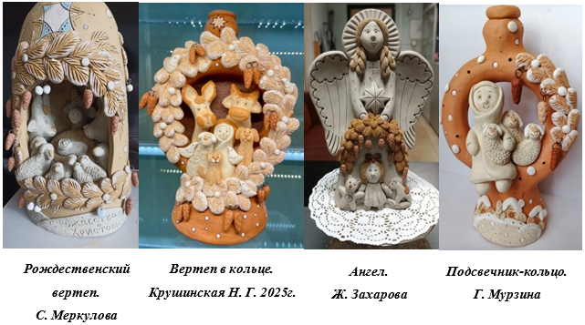 Особое место в дивеевской игрушке занимают сцены Рождества (Рис. 2), домашнего очага и семьи (Рис.3). Рождеству посвящаются вертепы, часто с надписями, зимние сюжеты в виде подсвечников, ангелочки. Так на обратной стороне вертепа в кольце Н.Г. Крушинская выполнила надпись: «Рождество твое, Христе Боже наш, Возсия мирови свет разума. В нем бо звездам служащие звездою учахуся, Тебе кланятися Солнцу правды, и Тебе ведати с высоты Востока: Господи, слава Тебе» [6].