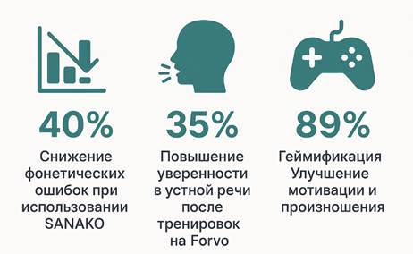 Обсуждение. Данные исследования подтверждают, что интеграция интерактивных технологий значительно повышает эффективность фонетического обучения. Использование персонализированных платформ позволяет студентам осваивать произношение более естественно, а геймификация снижает уровень речевой тревожности, что способствует повышению беглости речи.