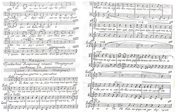 Рисунок 1. Л. Шлег. Фрагмент партитуры «Кондак Пресвятой Владычице нашей Богородице честному Ея знамению (еже в велицем Новограде)» из Концерта «Тебе поем» для 2 детских хоров из 12 антифонных песнопений на церковно-славянские молитвы (из архива автора)