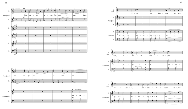 Рисунок 2. А. Бондаренко. Фрагмент партитуры «Похвала великому князю Владимиру І, для солистов, женского хора (I антифон), мужского хора (II антифон) и смешанного хора»
