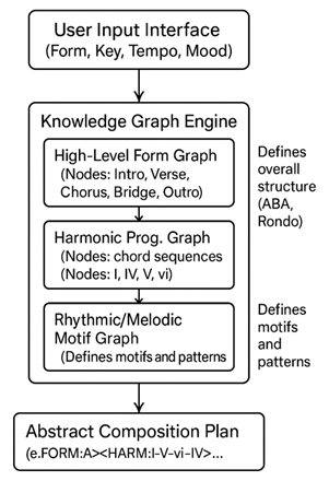 The Planner relies on an expanded knowledge graph intended not for direct synthesis of a note sequence, but for elaborating a high-level skeleton of the composition. Similar to the solution applied in the TerraGraph project, this graph accumulates the fundamental principles of music theory (for example, the rules of voice leading, functional tonal gravitations) as well as the stylistic specifics of various genres and authorial techniques. At this stage, the user specifies key parameters — the form of the piece (for example, sonata form, rondo structure, or ABA), tonal plan, desired emotional dynamics, tempo, and metric pattern. Based on these input data the Planner generates an abstract representation of the composition, which can be expressed via a tokenized sequence or a specialized structured format describing the harmonic progression, rhythmic contours of the main themes, as well as formal sections and their durations. The demonstration of such a graph-based planner at a hackathon showed that the hierarchy from motivic sketch to full form provides logical coherence and integrity of musical constructs [3].