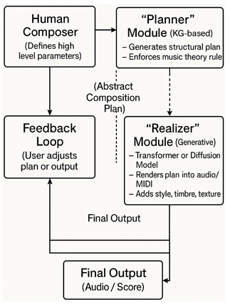 In summary, it should be noted that the hybrid approach — combining symbolic planning based on knowledge graphs with subsymbolic realization through deep generative models — represents a qualitative breakthrough in the field of AI composition. It removes the limitations of existing methods and establishes a robust technological foundation for genuine human-machine partnership, where strict algorithmic control coexists harmoniously with the richness of expressive and stylistic possibilities.
