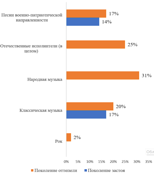 Поколение бумеров демонстрирует интерес к шансону и классике, что исследователь связывает с необходимостью осмысления сложного социокультурного пространства через призму жизненной философии, характерной для данного жанра [8].